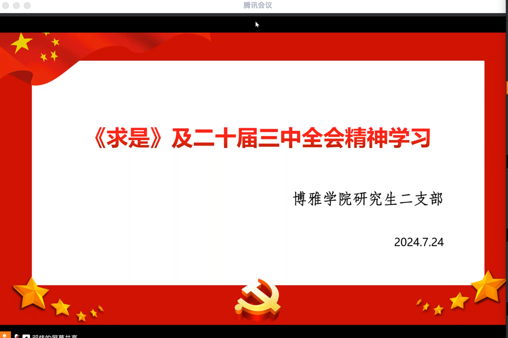 成人影片 研究生二支部开展“共读《求是》杂志,深入学习二十届三中全会精神”主题党日活动为进一步增强支部成员的理论素养,跟进学习党的最新会议精神,2024年7月24日上午9点半,成人影片 研究生二支部通过腾讯会议开展了“共读《求是》杂志,深入学习二十届三中全会精神”线上学习活动。本次活动由高波同志主持,支部全体党员、发展对象及入党积极分子积极参与学习讨论。阅读重要文章,增强党性修养。学习《求是》杂志是紧跟时...
