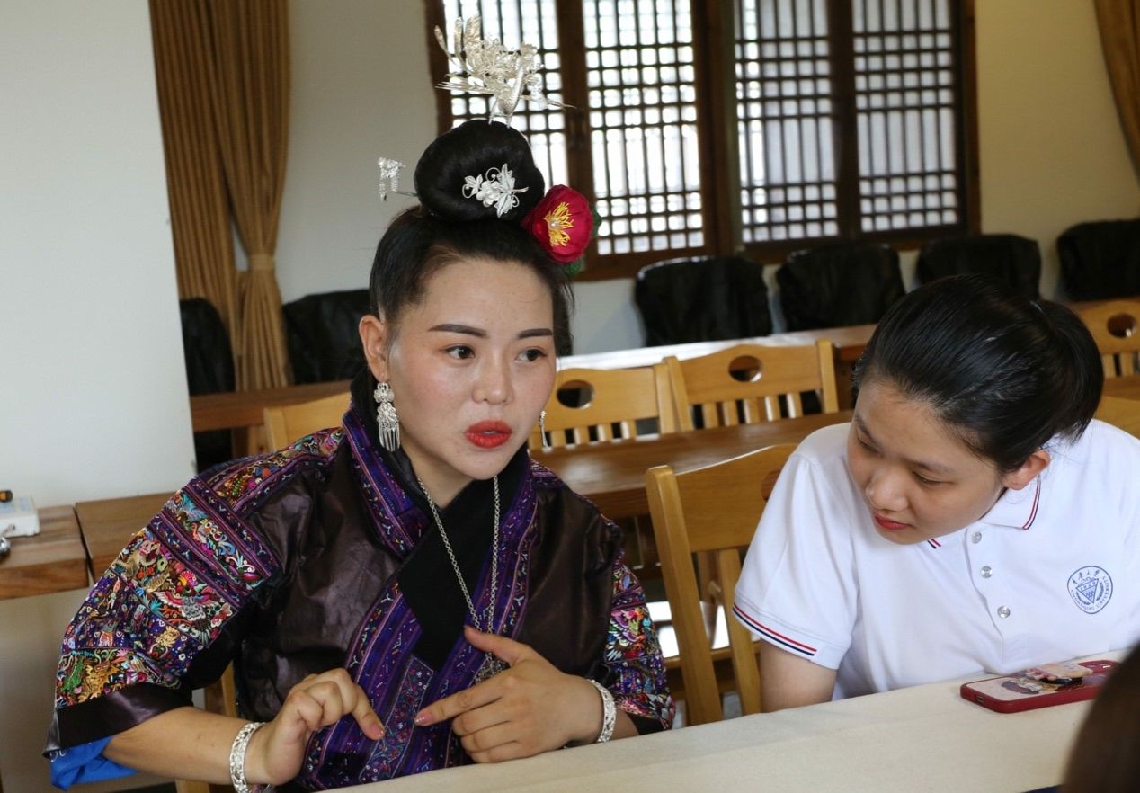 在会议室中,同学们对依贞进行了半结构式访谈。依贞的盛装最先引起大家的注意。她介绍,这是她与母亲共同缝制的盛装,已经有四十个年头。杨依贞还进一步向他们展示了更老一代盛装的照片。时间并没有在绣品上留下痕迹,老绣的针脚依旧细密,色彩依旧亮眼。这让他们对老绣产生了强烈的兴趣。“苗绣是个轮回。”依贞表示,一百多年前的审美,放在今天仍不过时。现今苗绣在纹样和配色上的创新,仍需要从老绣中汲取灵感与力量。汉族创新中华优秀文化的举措也如出一辙。近年来国潮兴起,《唐宫夜宴》、《祈》等国风舞蹈陆续“出圈”,惊艳四座,汉族人民也在传统文化的沃土中汲取创造创新的养分。