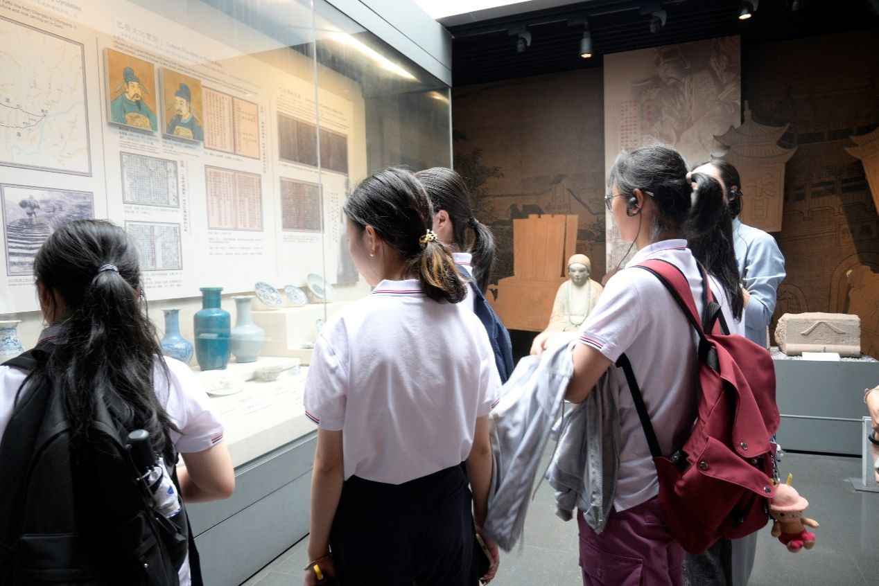同学们跟随讲解员下楼来到实物展区,首先观赏到的是镇馆之宝——释迦摩尼坐像,并以此像作为范例,了解了成佛标志、“千佛一面”等知识。随后,讲解员为同学们讲述了大足建县的历史,展区内各个雕像、陶制品等展品的信息,以及大足区域内具体文物保护单位的分布情况。