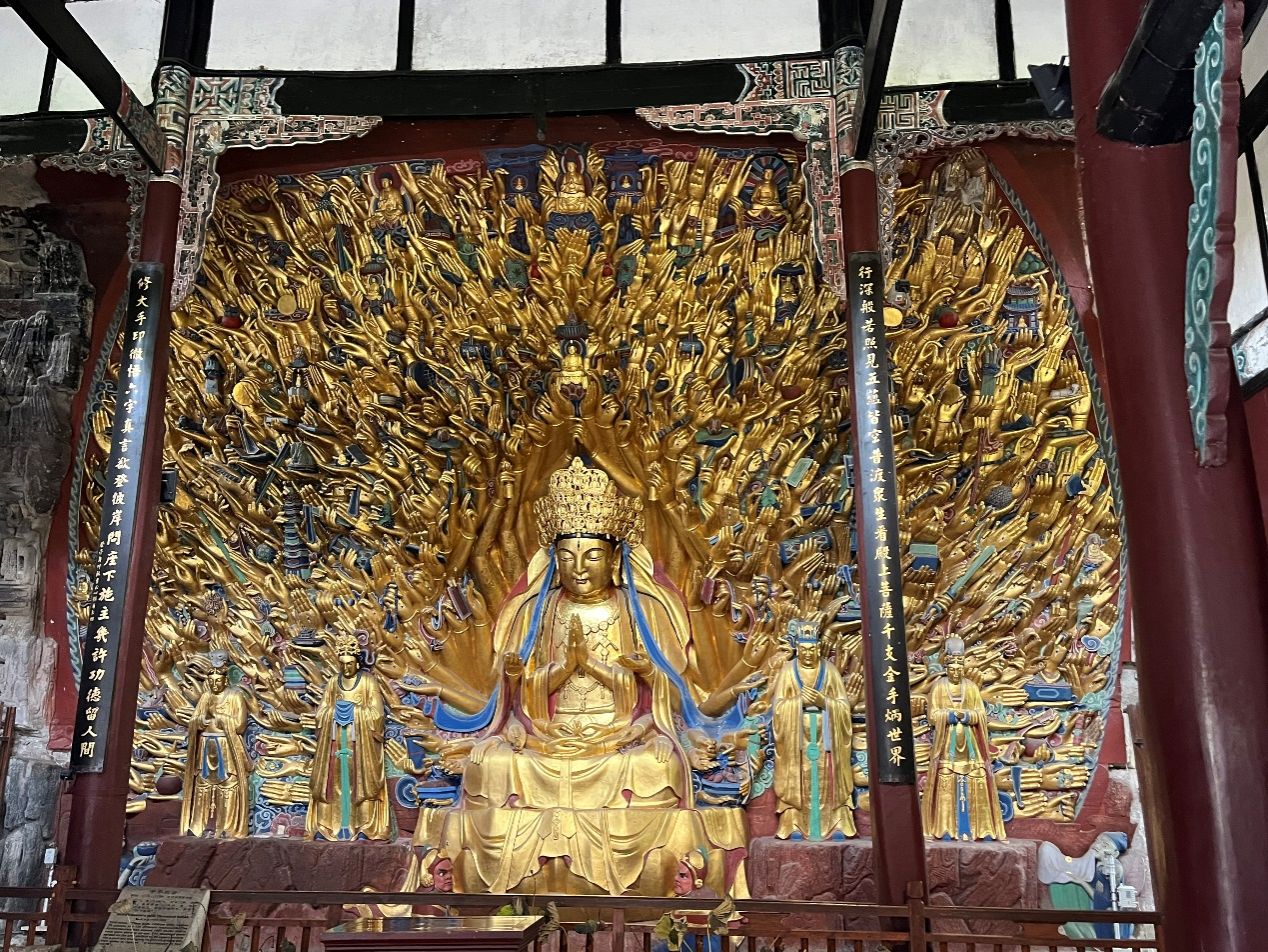 其中,宝顶山镇山之宝——千手观音像和大足石刻最大的卧佛——释迦摩尼涅槃圣迹图给同学们留下了深刻的印象。千手观音像是宋代工匠在88平米的石壁上为观音雕刻出了1007只形态各异的手,手掌中心刻画了眼睛与各类法器,千手千眼代表着观音的法力无边与智慧无穷。而卧佛则通过半身雕刻的方法,体现其“无穷大”的内涵。卧佛四周的水沟,不仅是九曲黄河的象征,也提供了排水的便利,与此功用相似的九龙浴太子图位于其左侧,而最左侧的孔雀大明王图则展现了孔雀明王保平安的能力。
