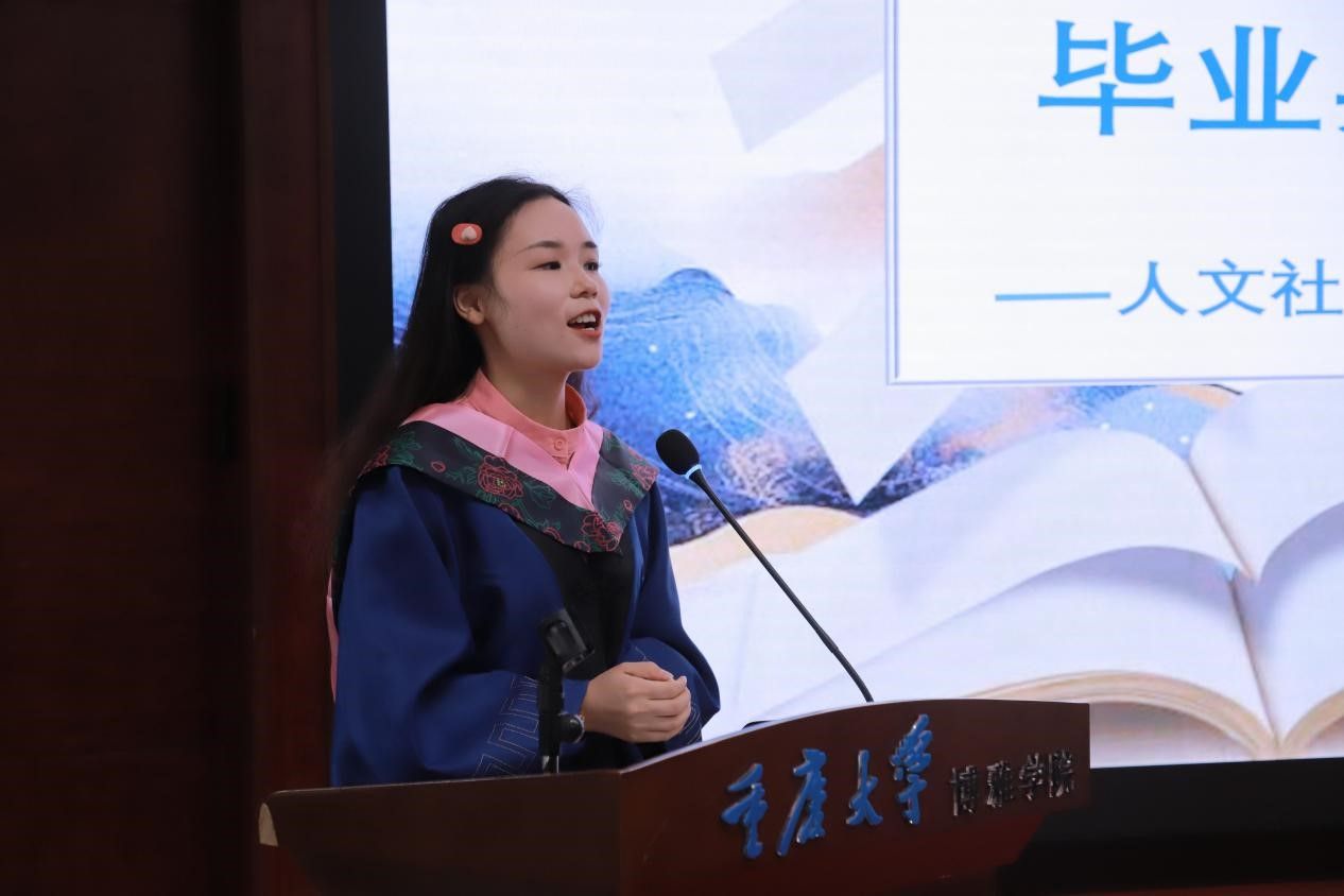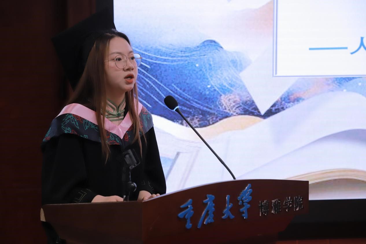 本科毕业生代表边雨柯的发言则以“博雅”为核心,通过“大一、大二读厚书,大三、大四读薄书”的比喻,讲述了逐步深入专业的过程。边雨柯还分享了学院如何通过书院制和小班教学模式,营造既自由开放又紧密团结的学习环境,使他们得以在学术探索与社会实践的双重滋养下茁壮成长。