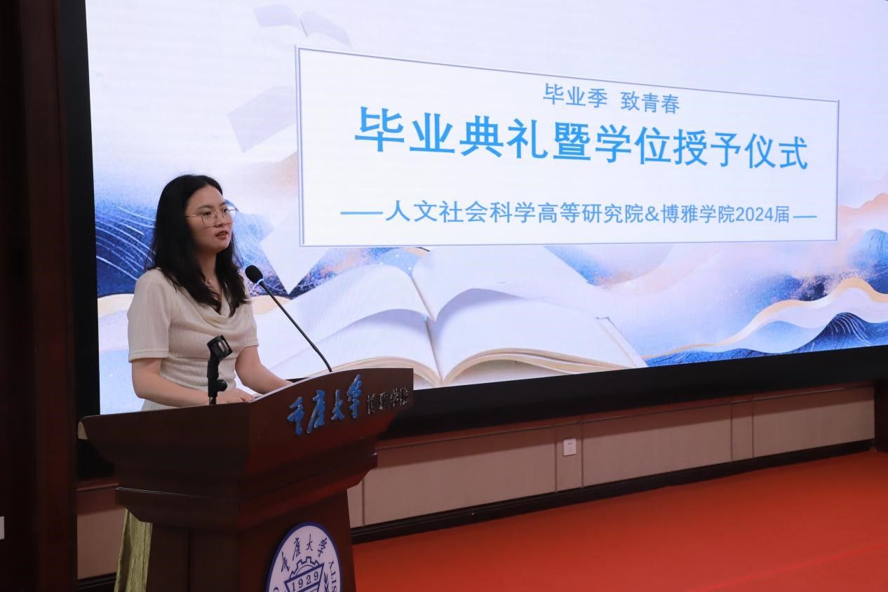 随后师生代表发言,硕士毕业生代表熊琳的发言充满了对学院的深情与对未来的憧憬。她讲述了在高研院的学习经历,从科幻之旅到史海钩沉,再到博雅小院的思辨场,每一处都留下了他们成长的足迹。她表达了对学院和老师们的深厚感激,并承诺将所学知识用于实践,追求卓越。
