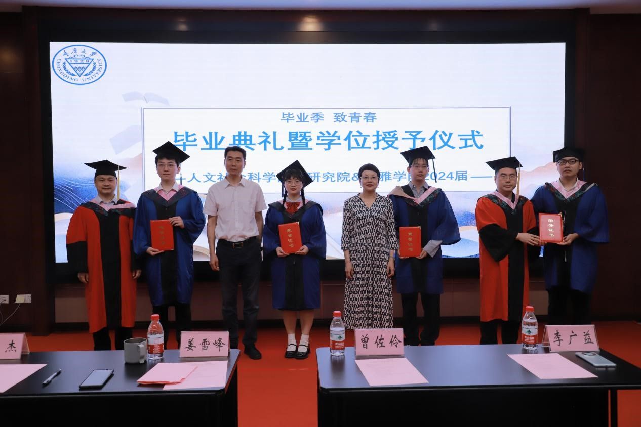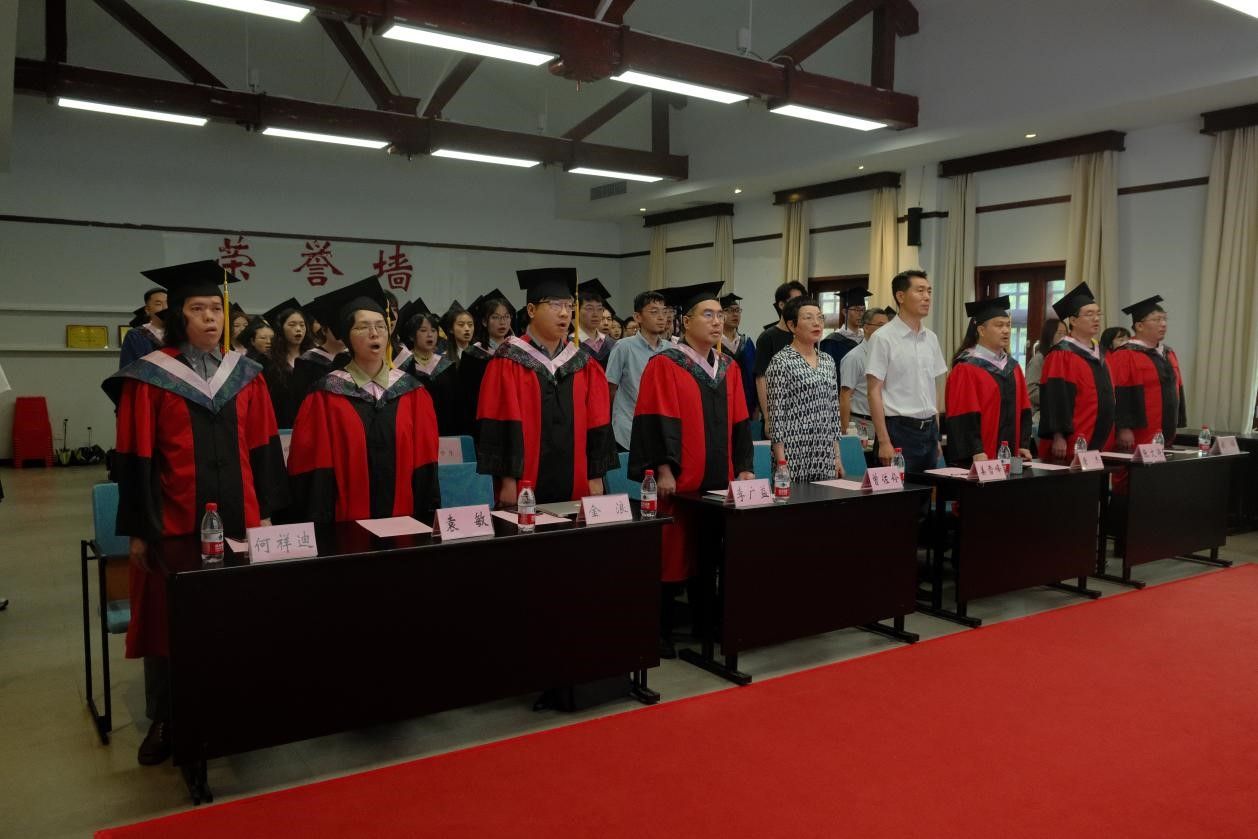 师生代表发言过后,由学院党委副书记姜雪峰宣读学院2024届优秀学位论文和优秀学生名单并进行颁奖,鼓励他们在未来的人生旅程中持续追求卓越。最后,毕业授位仪式开始,毕业生们身着学位服依次上台,由老师们为其拨穗并送上真挚勉励与祝福。典礼最后,全体同学齐唱校歌,这不仅是对母校的深切怀恋,更是对未来奋斗的铮铮宣言。