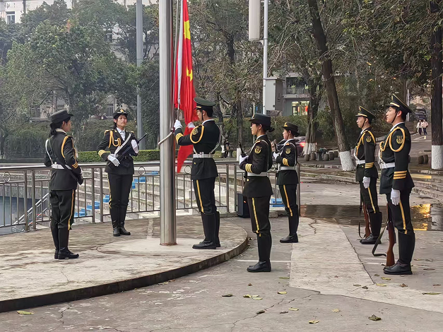 同学们均以饱满的热情参与此次活动,展现了重大学子昂扬的精神面貌。在整个升国旗仪式的过程中,天空渐渐泛起了亮色,浅红色的朝霞伴随着国旗一同升起,同学们齐声高唱国歌,充满了自豪与朝气,正如欧阳修曾写下的那句,“羡子年少正得路,犹始扶桑初日升”。每个人的目光都聚焦在那面缓缓上升的旗帜上,心中充满了对国家的热爱和对历史的敬畏。