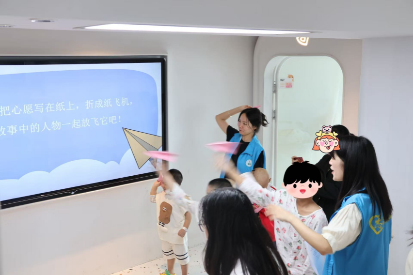 本次活动也给志愿者们带来了难忘的体验。在共读环节,虽然低龄儿童识字量有限,但令人感动的是,每位小朋友都在家长陪伴下坚持完成朗读,展现出极高的参与热情。在涂色环节,一位小朋友特意挑选了小猫线稿,边涂色边向志愿者讲述:"我要涂成灰色,因为我家的小猫就是灰色的。"她稚嫩的话语中,既流露出对爱宠的思念,也饱含早日康复的美好期盼。在"放纸飞机"环节,孩子们热情高涨,积极参与。在家长的陪伴和指导下,他们认真写下心愿,仔细折叠成纸飞机。随着一声声的欢呼,承载着"健康快乐""茁壮成长"等美好祝福的纸飞机一同起飞,在阳光下划出优美的弧线,带着孩子们的纯真期待飞向远方。
