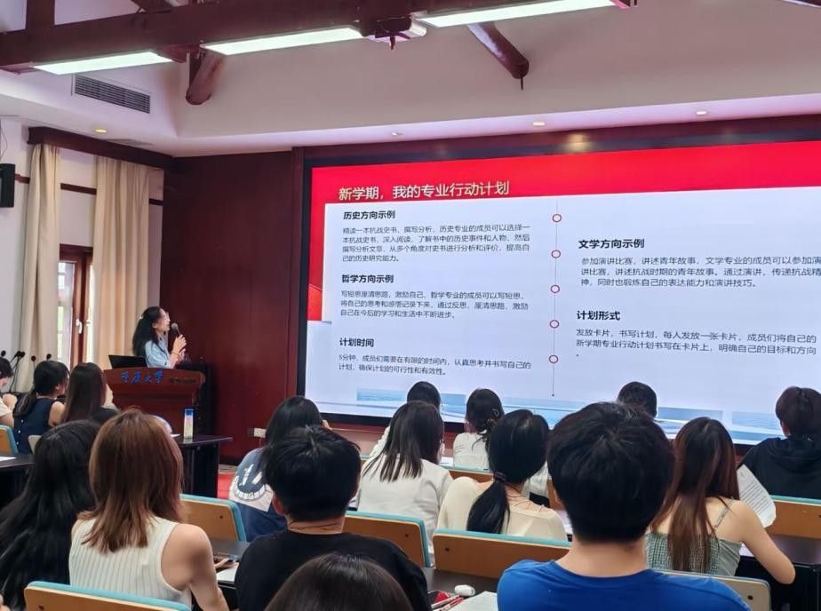 围绕新学期发展目标,各团支部积极引导团员将抗战精神转化为实际行动。2025级研究生团支部提炼出“文心、风骨、担当”等红色基因关键词,组织团员书写新学期寄语,立志通过校史宣讲、研读抗战文学等方式践行青春承诺。2022级本科生团支部、2023级本科生团支部、2024级本科生团支部结合专业特色,组织团员分享暑期社会实践成果,包括田野调查、大凉山支教、社区志愿服务等经历,鼓励团员将抗战精神融入社会服务。