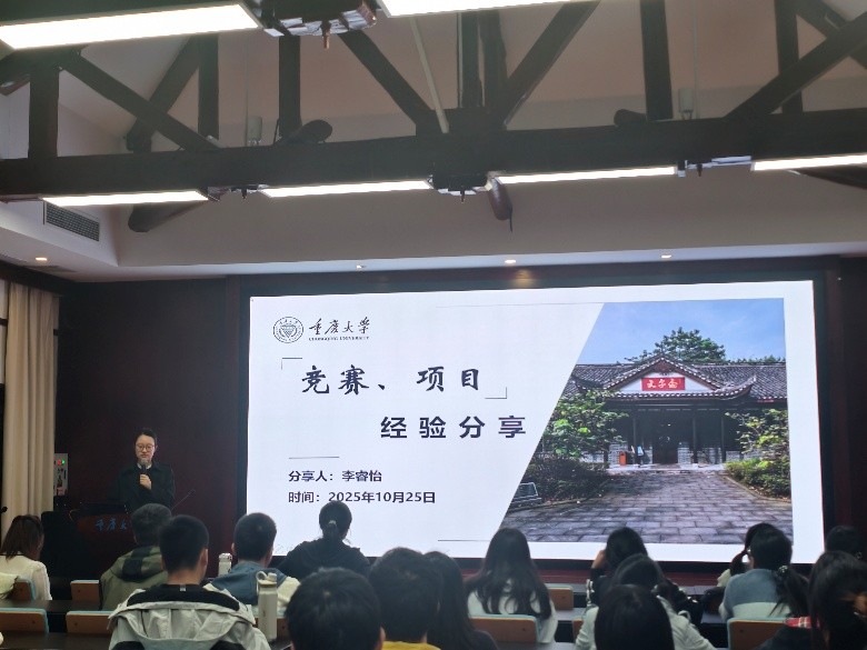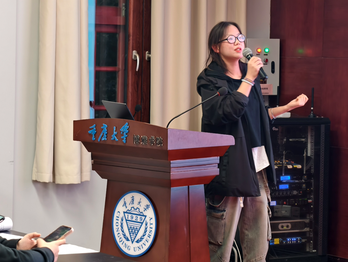 李睿怡同学则侧重“学科竞赛”经验分享,通过实例与数据说明了竞赛活动对学业发展及综合素质的促进作用,重点推荐了“大学生新文科创新实践大赛”“‘外研社·国才杯’全国英语演讲大赛”等赛事。她鼓励同学们跨学科组队参赛,结合兴趣选题,以拓展视野、提升创新能力。