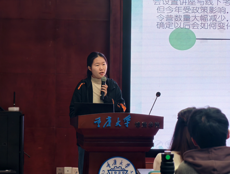 首位分享的毛一诺同学围绕“升学保研”主题,通过清晰的时序脉络与流程图,完整呈现了保研准备的关键环节与规划要点。她具体分析了保研政策中的核心指标,并强调科研训练、英语能力与经典阅读在综合评价中的重要性,建议同学们在方向选择上充分考量个人志趣。
