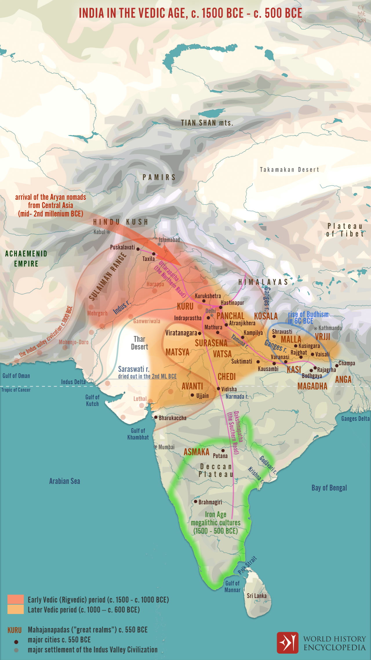 首先,标题中的“印度”,严格说是Hindu[印度教的],而非意义更宽泛的Indian[印度的],因此本书实际上在讨论主体的印度教文明,不涉及同属印度雅利安文明的佛教、耆那教等传统,更不涉及南亚次大陆上的非雅利安文明。其次,标题中的“古典”不指涉古印度年代上的“古典时期”(classical period),而是在体性上标记文明的“典范阶段”(classical stage)。在“印度古典文明”这个特殊的阶段,决定和塑造后世印度文明的典范性、尺度性典籍——śruti[天启听闻]与smṛti[记忆传承]——逐渐得到成立;从实际历史角度来看,该阶段涵盖了印度历史的整个上古、古典时期。[5]
