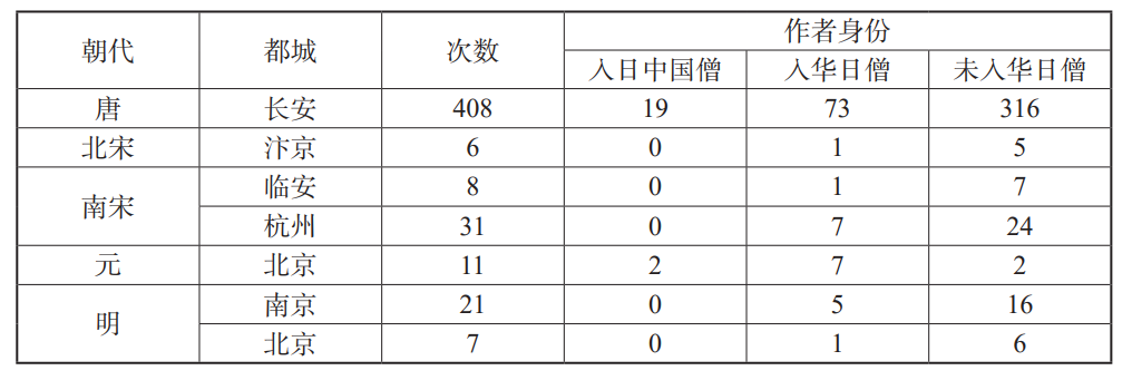 五山时期中日交流的中心由长安转移至临安,然而在五山诗人的创作实践中,临安几乎缺席,取而代之的是长安的再兴。由图表可见,在现实世界里对日本产生过巨大影响的临安,竟在文学创作中颇为边缘;而即使与同样较少出现的汴京相比,临安的“国都”面貌也更加模糊。宋神宗元丰五年,入宋日僧戒觉初至汴京时不禁赞叹:“今得瞻仰举世闻名之唐都,深庆我生之有幸也。”而与戒觉对汴京的向往不同,南宋时初至临安的日僧普遍没有表现出把临安作为都城的感知。在《五山文学全集》和《五山文学新集》中,仅有六位诗人提及临安,均为一笔带过,且多是指属县临安县,并非作为都城的临安府。