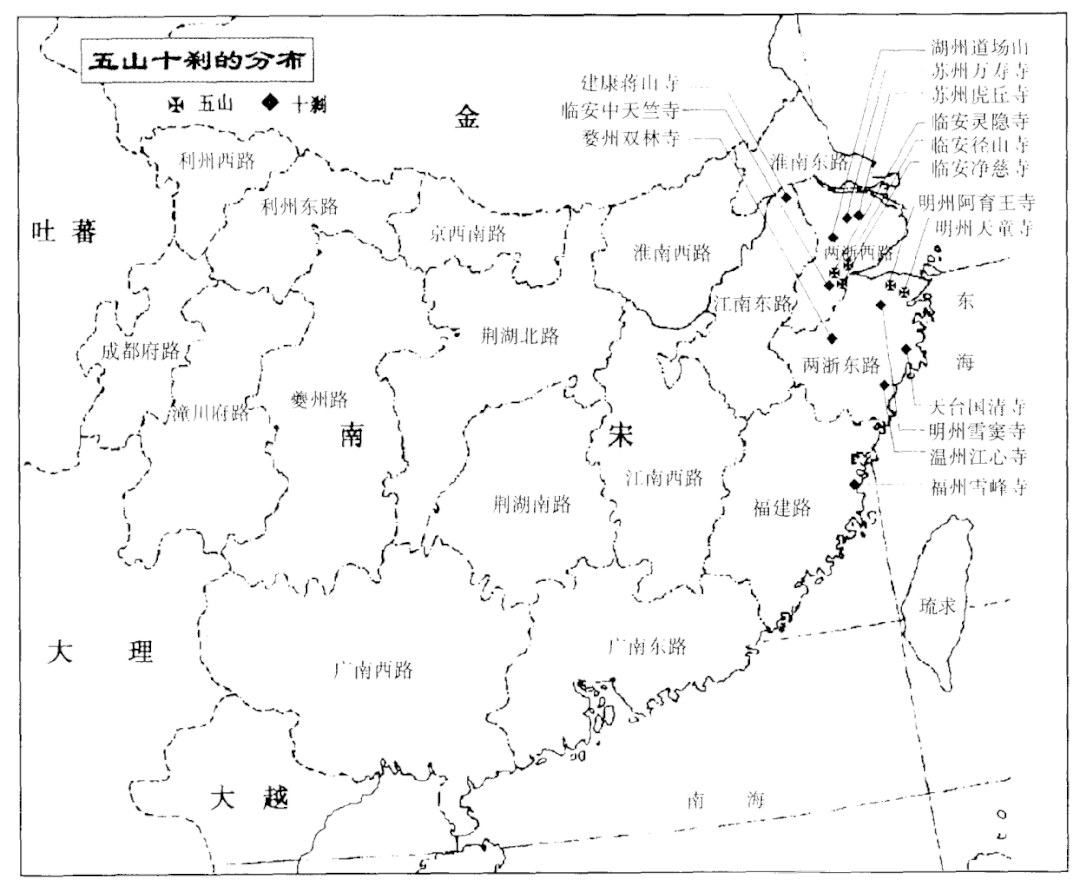 与遣唐使时代相比,宋日交流有三个显著特征:一是地域以临安为中心;二是人物以禅僧为主体;三是交流人数多,时间长。日记与笔谈是还原当时日本人临安见闻的最可靠的一手文献,然而日僧入南宋的日记欠缺,笔谈记录也多散佚;当缺乏文献证据时,便需要从生活世界进行还原。以下分别从图录、器物、制度三个层面还原日本人眼中的临安。在流传于日本五山时期的图录中,《五山十刹图》对临安禅宗圣境想象的建构极为重要。在日本流传的“图上临安”可分两类:一类是中国人所作,另一类为日本人所作。第一类包括南宋疆域图、临安城郭图等,例如《临安县图经》已被五山诗人熟读并引用;又如1241年圆尔辨圆回归日本时带回《历代地理指掌图》,其中第44幅《圣朝升改废置州郡图》标明了“杭,升临安府”。但日本人对中国人绘制的临安图兴趣有限,真正在日本产生巨大影响的是日僧绘制的《五山十刹图》。