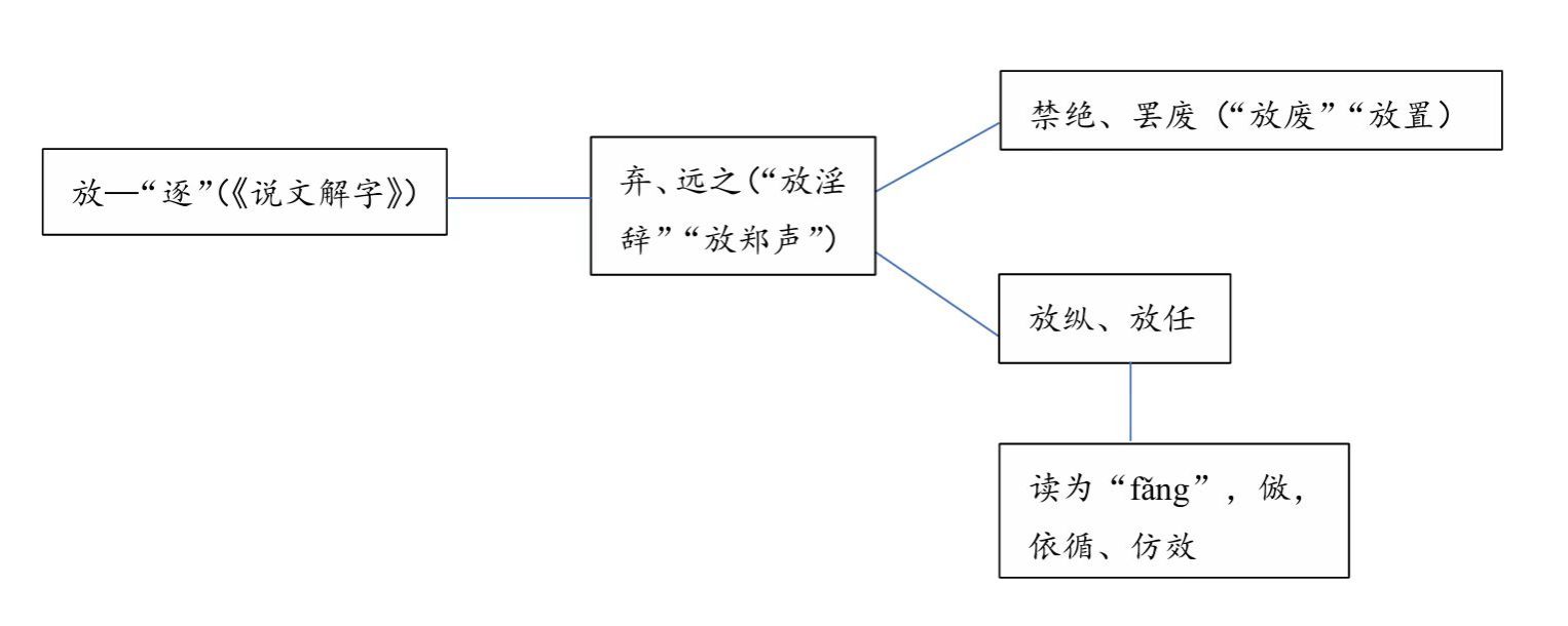 宗福邦《故训汇纂》总结了语词“放”的训释共计104条,《王力古汉语词典》则将同类训释合并成九项,其所呈现的主要语义演进脉络大致如下[7]: