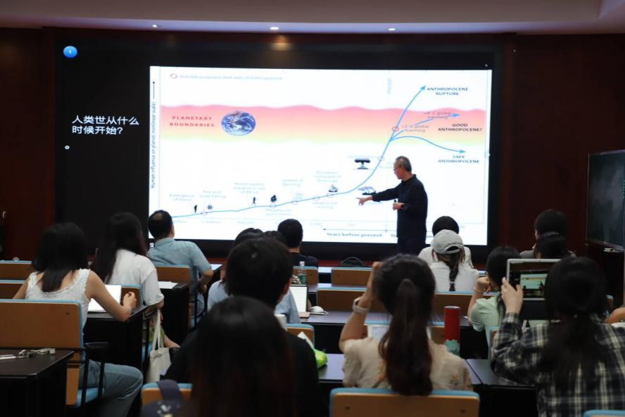 讲座伊始,任海教授借电影《宇宙探索编辑部》的片段,提出了两个引人深思的问题:“艺术实践和感知审美如何让我们面对环境恶劣和气候变化?”以及“智能技术的飞速发展对人类造成了怎样的影响?”沿着这两个主线问题,任海教授从六个部分展开了本次关于未来主义感知审美的讲演。