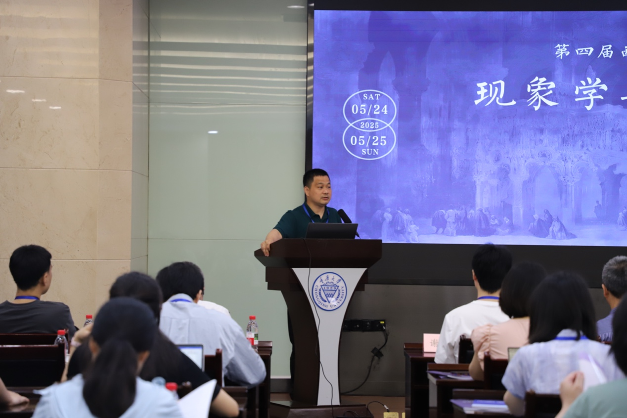合影后,进入分论坛报告环节。本次论坛开设三个分论坛,分别设于主教学楼504、510、515;持续五场,共计举行十五组报告。24日上午11时,第一场分论坛如期展开。第一组报告由陈小文先生主持,吴增定教授点评。四川大学哲学系的岳富林副教授在《胡塞尔第一哲学的演变历程及其内在逻辑探究》中指出,胡塞尔的“第一哲学”概念具有多重含义,在科学形而上学、超越论第一哲学、原事实形而上学之间存在交互奠基的复杂关系。南开大学哲学院博士研究生杨萍萍在《从“感知明见性”到“阻抗体验”--舍勒对实在性的重新奠基》中提出,舍勒批判了胡塞尔的“还原”概念,通过将阻抗体验作为实在体验的原则,以“生命冲动—阻抗”的动态关系,取代了“意识-意向性”静态结构。重庆大学哲学系谢利民教授在《重建第一哲学的现象学道路——思辨现象学引论》中表示,第一哲学的核心是从特定秩序的第一者引申出统一化的世界图景,然而第一者的绝对性与独立性引发了无法弥合的二元分裂,以活性为中心的思辨现象学或为突破困境的可行方案。第二组报告由冀志强教授主持,王嘉新教授点评。四川师范大学周振权副研究员在《开端问题:现象学如何面对“明希豪森”三难的挑战》中,运用现象学的自明性原则、本质直观方法,回应了“明希豪森”三难困境。西北师范大学哲学与社会学院朱海斌副教授在《现象学与先验论证》中针对先验论证,阐释了现象学传统与分析哲学传统的不同,提出“本质变更”可以一定程度上缓解先验论证的困难。九江学院刘系舟博士在《克里斯蒂娃论胡塞尔的先验主体》中提出,克里斯蒂娃将先验主体重构为动态的过程性主体,从而解构了现象学的封闭主体。第三组报告由张云翼研究员主持,张柯教授点评。武汉大学哲学学院刘任翔副教授在《同于存在还是异于存在?——重思海德格尔与萨特的虚无学说》中指出,海德格尔和萨特都拒绝承认虚无仅来自于逻辑的否定,然而这背后有着迥异的问题意识。西北师范大学哲学与社会学院王珅副教授在《同感的三个向度》中以“同感”概念为切入口,探究了“同感”的他人向度、道德向度和他物向度。四川轻化工大学陈亮副教授在《青年海德格尔对历史哲学的拆解》中重构了青年海德格尔对历史哲学的拆解,展示了其拆解的理论价值。