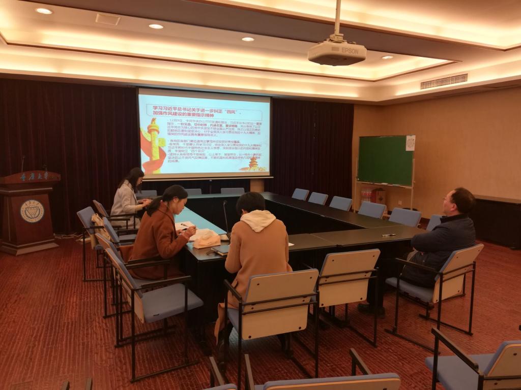 陈靖同志带领支部成员学习习近平总书记关于进一步纠正“四风”、加强作风建设的重要指示精神,学习党章、《中国共产党纪律处分条例》和《中国共产党支部工作条例(试行)》等内容。支部书记郑家勤述职,报告了2018年一年来支部党建工作开展情况、党员发展和党员培养情况,全体党员对党支部的工作开展、支部建设存在的问题、以及支部班子的工作作风等进行评议。其后,开展了支部党员个人自评和党员互评活动。韩蕾同志从个人生活、工作的实例出发进行自我评价,反思自身理论学习不足的问题。支部同志就支部成员的大局意识、理论学习纪律观念等方面进行了相互评议。支部书记郑家勤总结此次活动,指出支部党员应增强理论学习意识,结合博雅教育本身思考理论学习的方法;并且要加强党员联系群众、团组织的力度,发挥党员的模范带头作用。