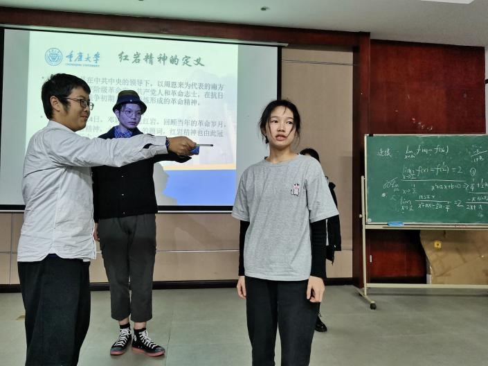 为了加深同学们对红岩精神的理解,切实传承红岩精神,同学们还围绕红岩精神准备了丰富多彩的节目:倪睿启、张婧婍、杨盛尧、向锦辉深情朗诵《红岩》,字句铿锵抑扬顿挫,回顾山城风起云涌的岁月,诉说血染红岩的赤胆忠心,站在后人的角度敬仰先烈,令“太阳烘干的历史”重获新生,赢得全场掌声;何宇轩、陈海梁一首《乡愁四韵》歌出狱中哀愁,道尽离愁别绪,令人仿佛置身晦暗潮湿的狭小囚室,滔滔大江仍在胸中激荡回响,坚信血染海棠红即将开满天下;江际哲、盛夏、乡晓敏、陆宁宇、刘雨茜上演解放前夕的山城风雨,军统头目残杀狱中革命者,烈士许云峰宁死不屈英勇殉难,他们的激烈对峙令在场同学无不动容,沉浸其中久久不语,生动阐释了红岩精神蕴含的爱国情怀。