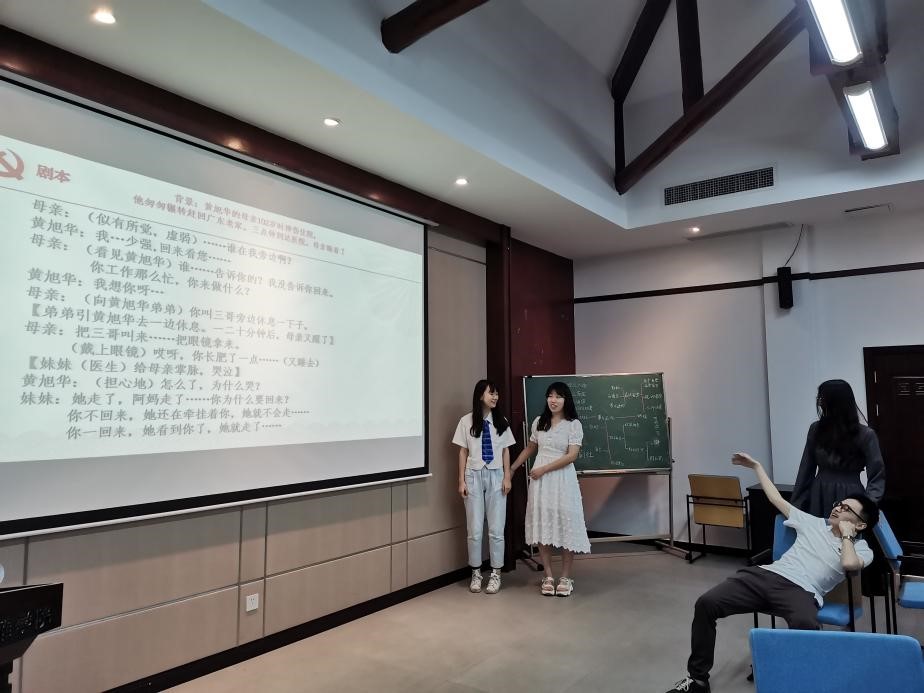 接下来,为了细化、深化成员们的认知,学习重点经由游戏词汇聚焦到了“核潜艇研制”上。主讲人重点介绍了我国核潜艇事业发展艰苦而辉煌的历程,带领我们走近“核潜艇之父”黄旭华“赫赫而无名”的一生。在这一环节中,四个小组分别选出了一位成员,上台对黄旭华与母亲诀别的感人场面进行真情流露的现场演绎。看过了视频和同学们的表演,大家对工匠精神有了更为深刻的感受。