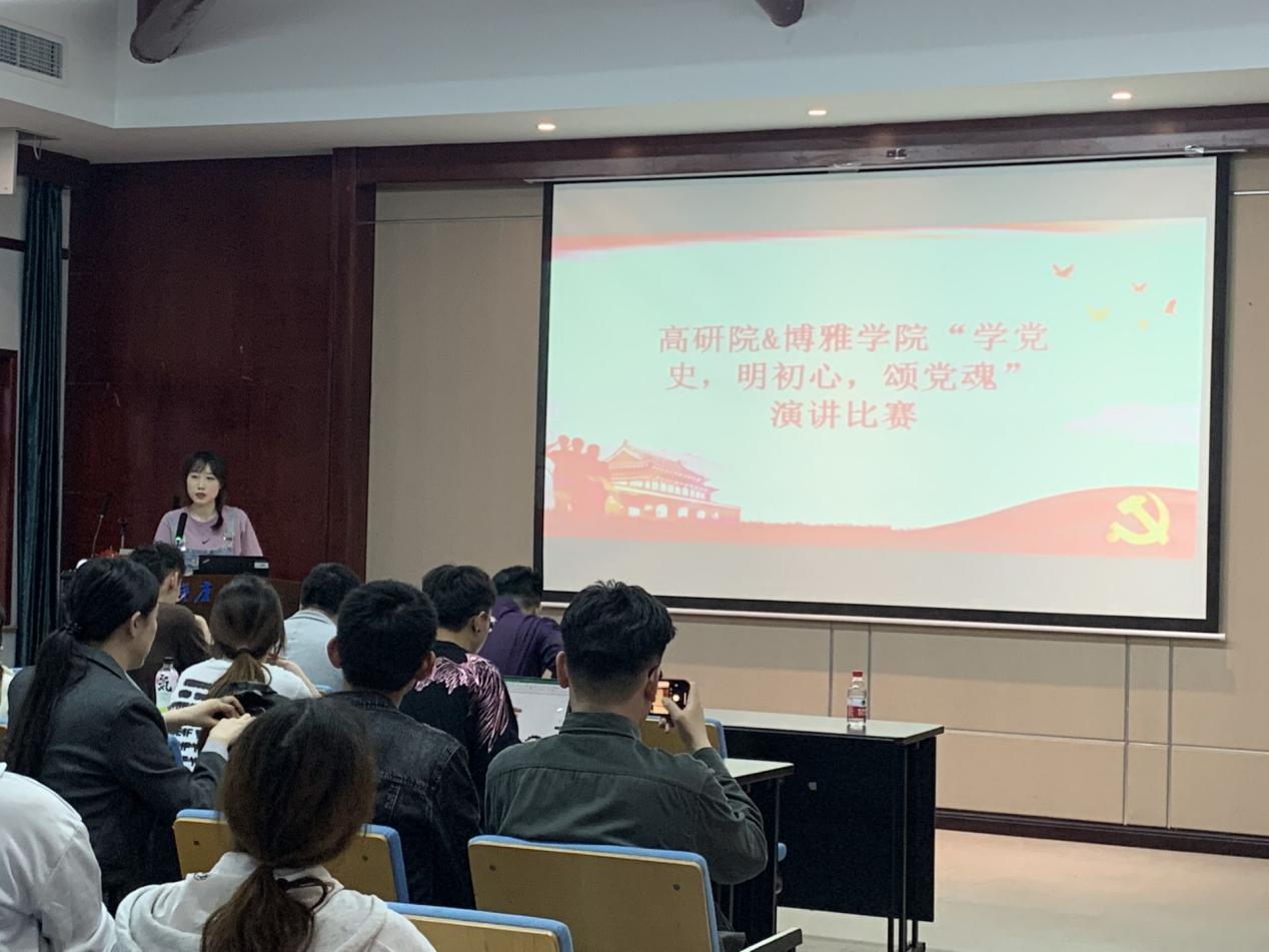 为深入学习贯彻习近平新时代中国特色社会主义思想,巩固深化 “不忘初心、牢记使命”主题教育成果,庆祝中国共产党成立100周年,深入开展党史学习教育,4月23日下午,高研院&成人影片 “学党史、明初心、颂党魂”演讲比赛在博雅小院报告厅举行。学院党委副书记胡佳,教师董涛、宋玉,学生办公室主任郑家勤和本科生辅导员高宏佳出席本次活动并担任评委。