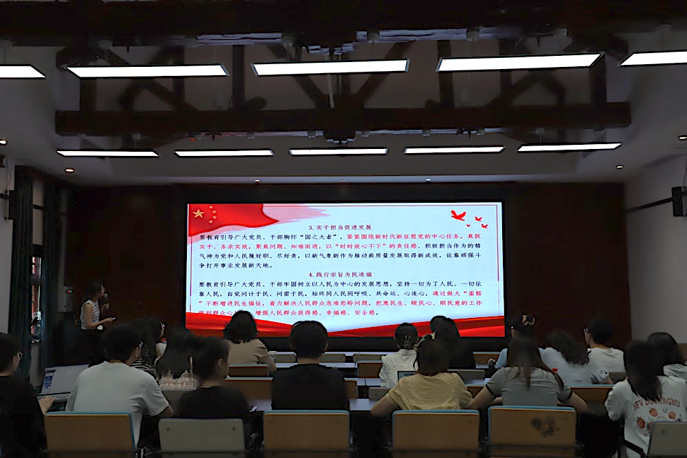 研究生二支部在小院报告厅召开了专题民主生活会。此次生活会共分为四个环节。首先,尹雪同志带领全体成员集中学习了学习贯彻习近平新时代中国特色社会主义思想主题教育的具体内容。主题教育以问题为导向,聚焦“学思想、强党性、重实践、建新功”总要求,对照凝心铸魂铸牢根本、锤炼品格强化忠诚、实干担当促进发展、践行宗旨为民造福、廉洁奉公树立新风具体目标,着力从思想根源上解决问题。其次,支部书记郑老师对上半年的支部工作情况作了述职报告。郑老师从理论、实践、队伍建设、反思与计划这四个方面展开讲解。紧接着,全体参会党员分小组开展批评与自我批评。同志们在这一环节中既谈自身缺点又谈对方问题,深刻进行党性分析,在对话与交流中发现自身不足并提出改进措施。最后,党委委员袁敏老师对支部工作进行了指导。