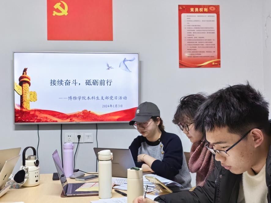 本科生支部于2023年1月3日在博雅小院小会议室开展“接续奋斗,砥砺前行”——习近平总书记2024新年贺词学习活动。本次活动由支部书记高宏佳同志主持,本科生支部党员、预备党员参加。