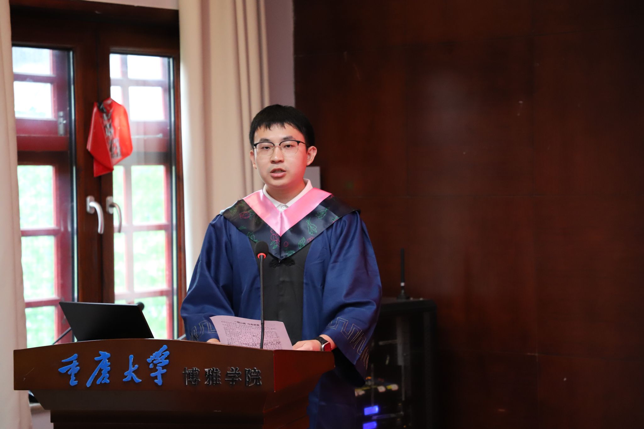 嘉陵江畔,学府宏开。重庆大学以卓越、广博的平台为学生发展提供了无限机遇。就我个人切身体验而言,这三年来,有文明精神、野蛮体魄,研究学术、造就人才的上进氛围,有定向选调、服务基层,佑启乡邦、振导社会的就业渠道,也有校长座谈会领导亲自聆听学生心声与呼声的温情关怀,更有始终坚持全心全意助力学生全面发展的教职员工。大学之道,在明明德,更在于一撇一捺的人字之上。因此非常感谢学校为我们所提供的一切资源与帮助,对于即将到来的百年新重大,我愿献上最衷心的祝福,愿我们的重大越来越好!