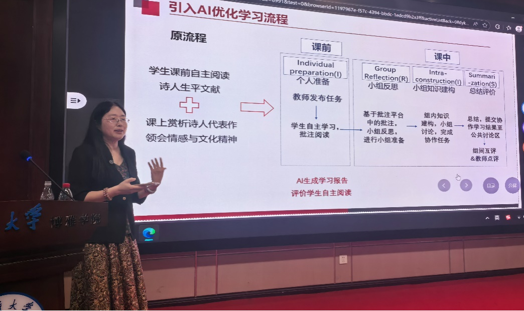 她指出,AI赋能使得基于任务或项目的教学得以更加便捷和可能,灵活组织各种教学资源和学习活动,融通线上线下、理论与实践各种教学场景,设定个性化的学习路径,支持开展各种教学模式改革,实现高阶的教学精准设计等。从而真正实现由教师为主向学生自主学习与研究性学习转变;通过项目教学、案例教学、实践教学、混合教学等模式,促进人文课堂转变为以学生为主体、知识探索式的生成式教学。